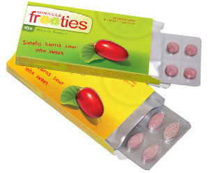 Miracle Frooties contain first-grade dried miracle fruit pulp. Fresh miracle berries are freeze-dried moments after being picked to produce miracle berry powder with the same effect as fresh berries. The powder is compressed into tablets that are dissolved on the tongue.